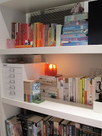 I love the way the bookcase came out. Since these shelves are pretty deep I was able to layer some of the smaller books to give it more depth and interest. They said to do it whichever looked best, not necessarily by subject or author.
